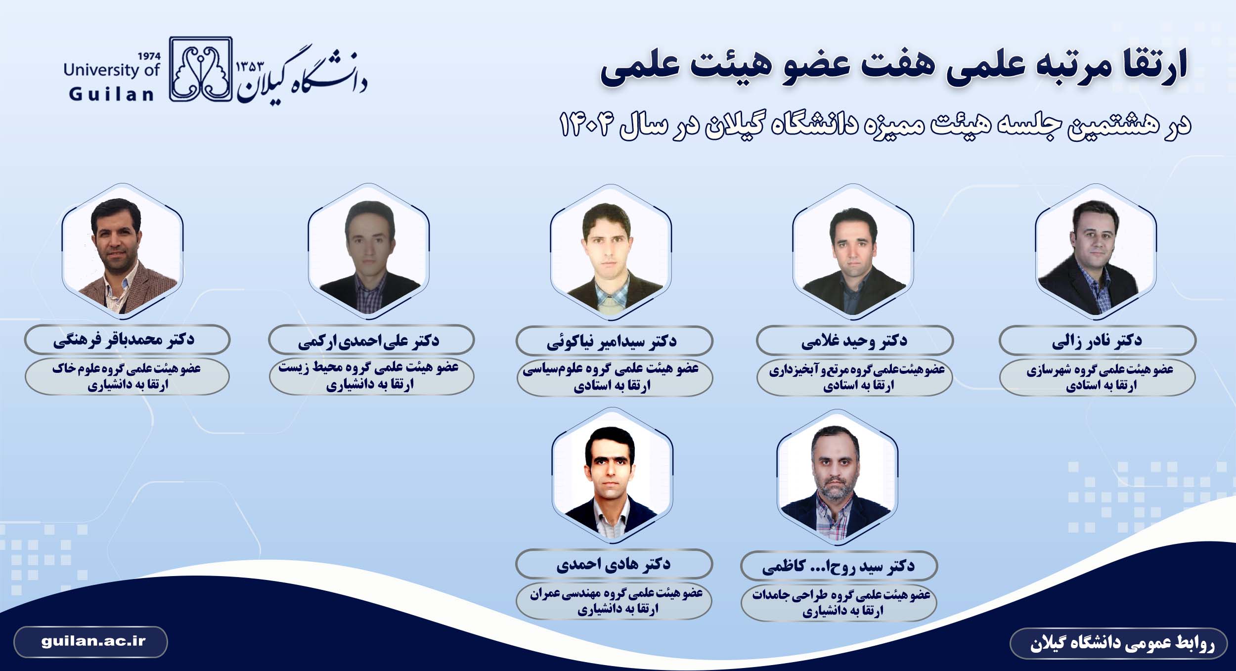 هشتمین جلسه هیئت ممیزه دانشگاه گیلان در سال جاری، امروز سه‌شنبه 11 آذرماه 1404 در اتاق شورای حوزه ریاست برگزار شد که در این نشست با ارتقای مرتبه علمی هفت عضو هیئت علمی دانشگاه به شرح زیر موافقت به عمل آمد.